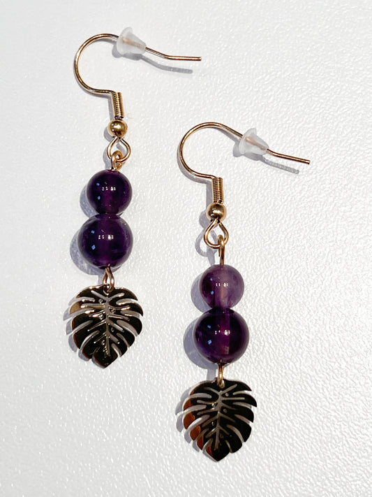 Boucles d'Oreilles en Acier Inoxydable Doré avec Améthyste et Feuille – Style Raffiné