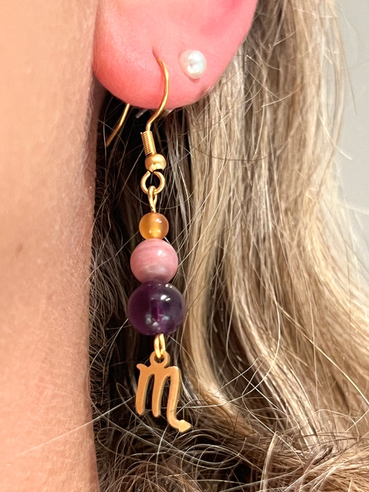 Boucles d'Oreilles Doré Scorpion en Acier avec Améthyste, Rhodochrosite et Cornaline