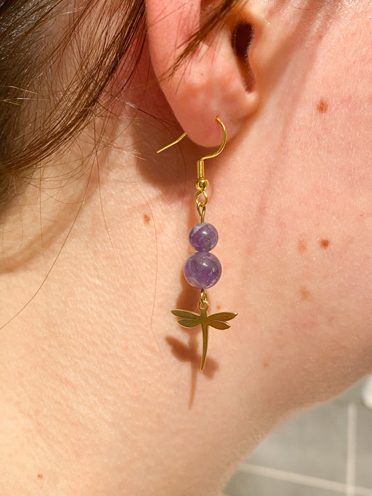 Boucles d'oreilles dorées en améthyste et libellule : raffinement et sérénité