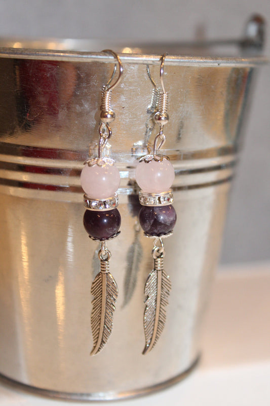 Boucles d'oreilles plume avec pierre naturelle Améthyste et Quartz rose