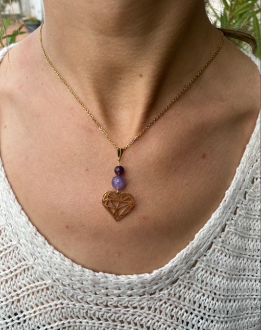 Collier Cœur Améthyste Naturelle - Acier Inoxydable Argenté - Pierre de Naissance Février
