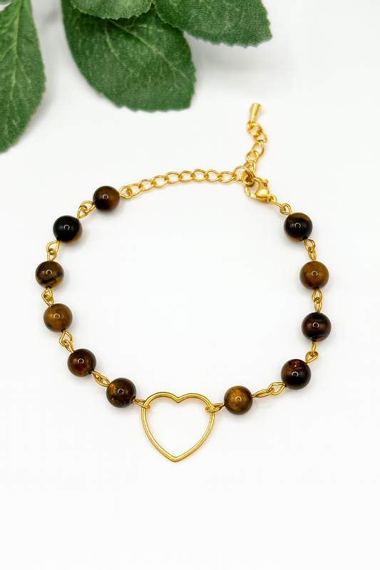 Bracelet Œil de Tigre Naturel – Bijou Lithothérapie Cœur & Acier Doré Hypoallergénique