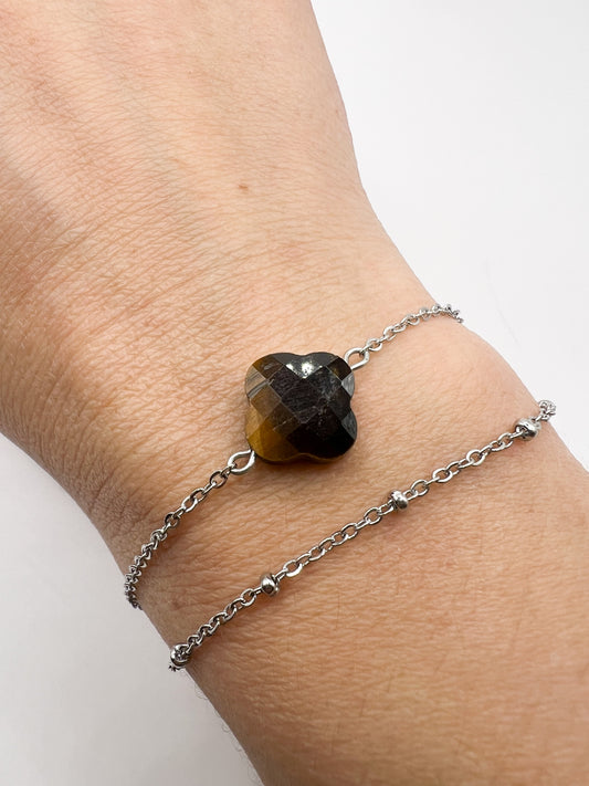 Bracelet Œil de Tigre & Trèfle en Acier Inoxydable Argenté – Protection & Chance