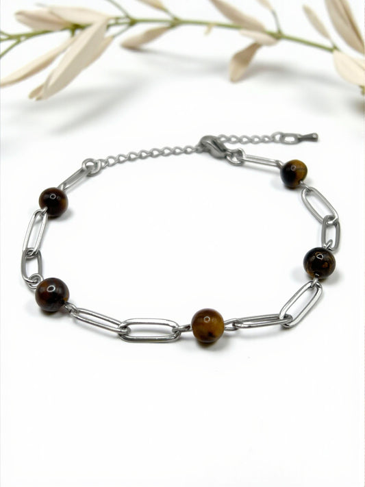 Bracelet en Œil de Tigre et Acier Argenté : Bijou Chic et Spirituel