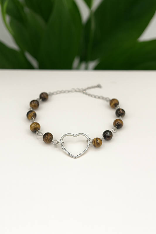 Bracelet Cœur en Œil de Tigre & Acier Inoxydable Argenté – Protection, Confiance & Énergie Positive