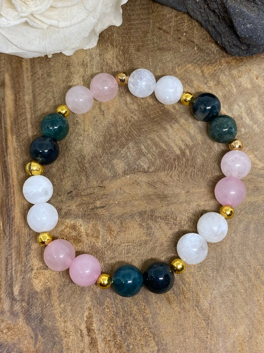 Bracelet règles douloureuse en agate mousse, quartz rose et pierre de lune