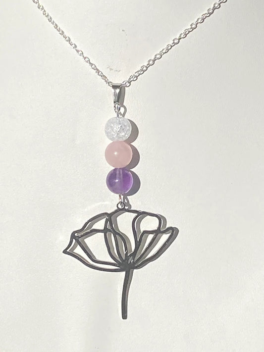 Collier en acier inoxydable avec pierres naturelles Améthyste, Quartz rose et Cristal de roche