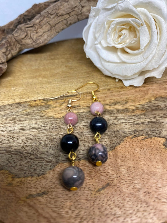 Boucles d'oreilles en pierre naturelle Rhodochrosite, rhodonite et Obsidienne noir