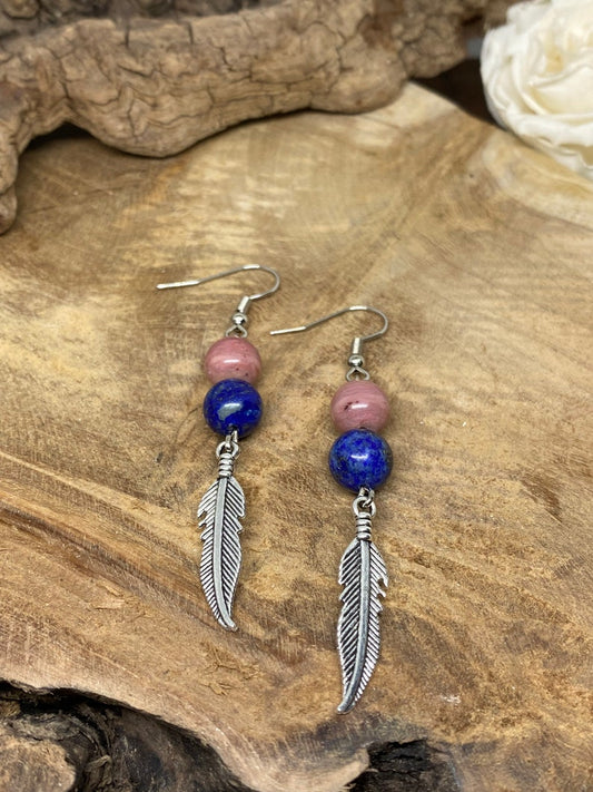 Boucles d'oreilles plume avec pierre naturelle Lapis Lazuli et Rhodochrosite