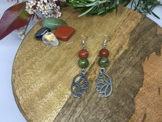 Boucles d'oreilles lotus en Jaspe Rouge et Unakite