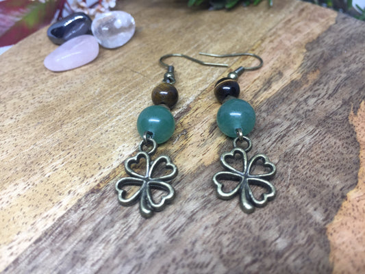 Boucles d'oreilles trèfle avec pierre naturelle Œil de tigre, Aventurine