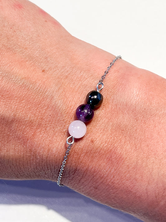 Bracelet bien-être en pierres naturelles : quartz rose, améthyste et hématite monté sur acier inoxydable argenté