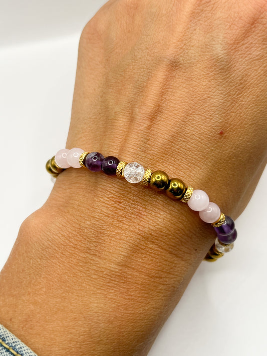 Bracelet Quartz Rose, Améthyste & Hématite Doré 8mm – Énergie & Équilibre