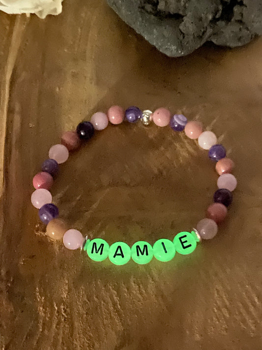 Bracelet en pierres naturelles Quartz rose, Améthyste et perle fluorescente