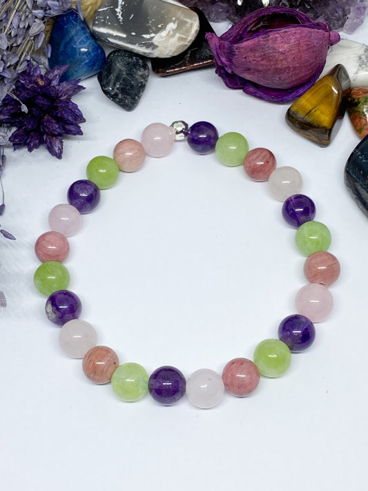 Bracelet Améthyste, Péridot , quartz rose et rhodochrosite