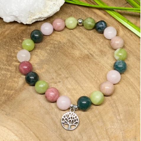 Bracelet Lithothérapie en pierres naturelles Agate mousse, Péridot, Quartz rose et rhodochrosite