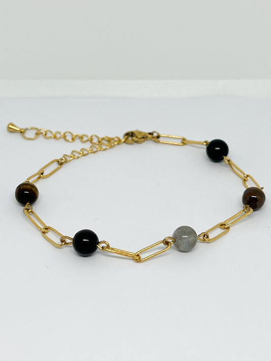 Bracelet Protection en Labradorite, Œil de Tigre et Obsidienne Noire - Acier Inoxydable Doré