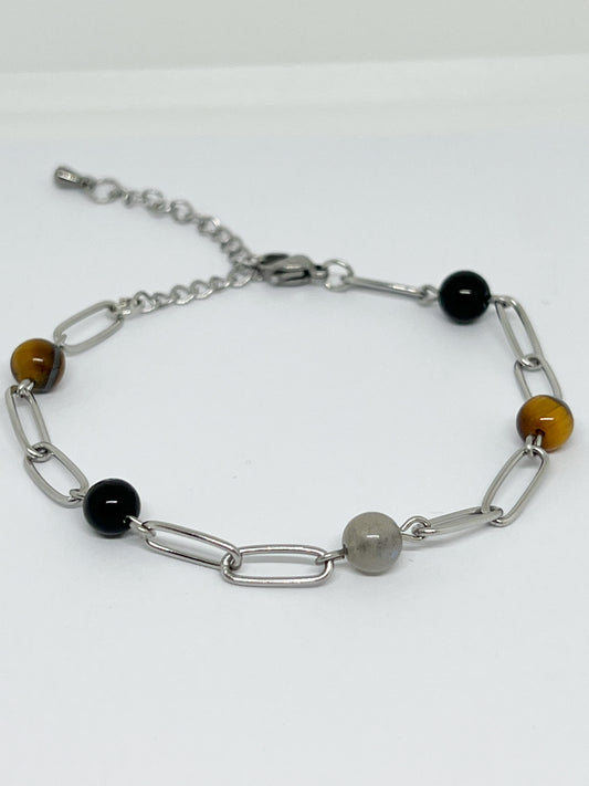 Bracelet de Protection en Acier Inoxydable Argenté avec Labradorite, Œil de Tigre et Obsidienne Noire – Élégance et Énergie