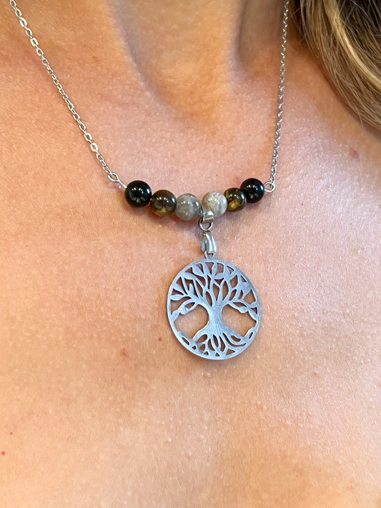 Collier Arbre de Vie en Acier Inoxydable Argenté avec Labradorite, Oeil de Tigre et Obsidienne Noire – Bijou Protections
