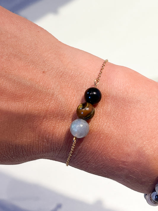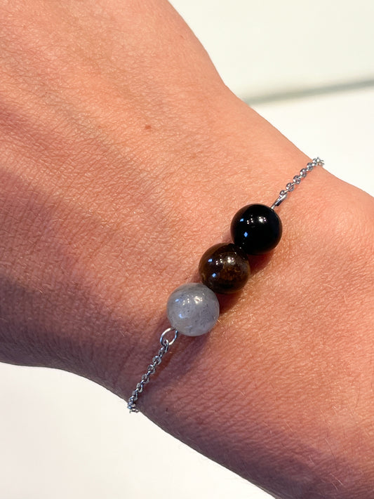 Bracelet protection en Œil de tigre, Labradorite et Obsidienne noire