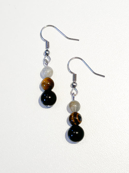 Boucles d'Oreilles Protection en Obsidienne Noire, Œil de Tigre et Labradorite – Acier Inoxydable