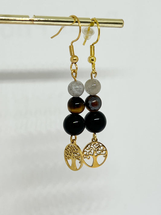 Boucles d’Oreilles Protection en Acier Doré avec Obsidienne Noire, Oeil de Tigre & Labradorite – Breloque Arbre de Vie