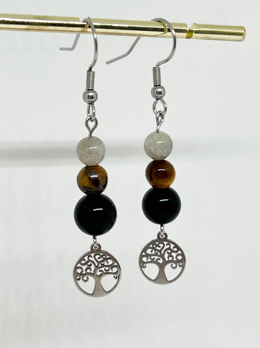 Boucles d’Oreilles Énergétiques en Obsidienne Noire, Œil de Tigre & Labradorite – Acier Argenté et Arbre de Vie