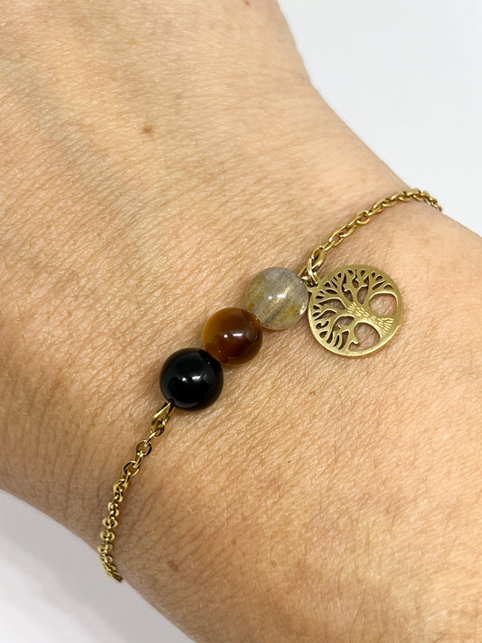 Bracelet de Protection en Acier Doré avec Pierres Naturelles et Arbre de Vie