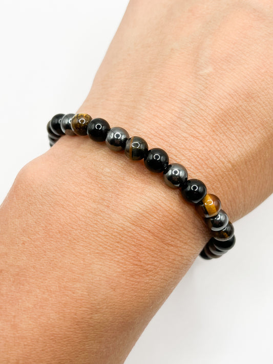 Bracelet Lithothérapie Protection – 6mm Œil de Tigre, Hématite, Obsidienne Noire