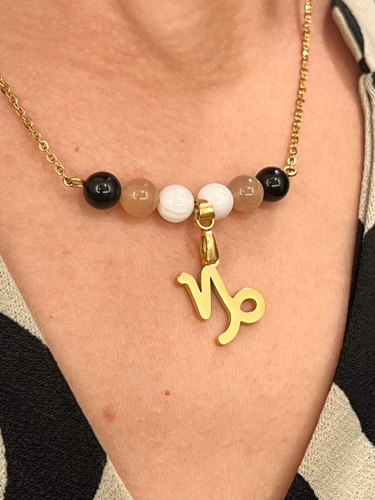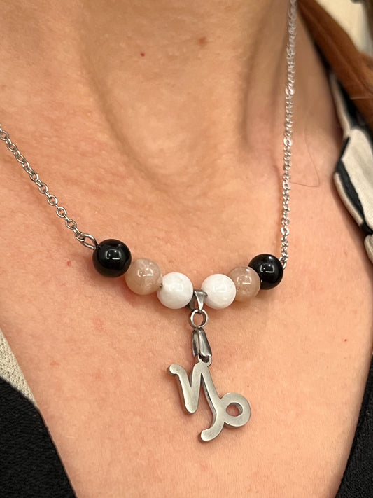 Collier Capricorne en Acier Inoxydable Argenté avec Pierres Naturelles – Élégance et Énergie