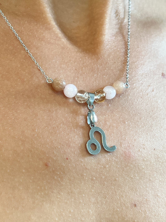 Collier Astro Lion en Acier Inoxydable Argenté avec Citrine, Quartz Rose et Pierre de Soleil