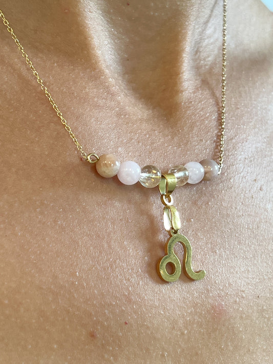 Collier Signe Astrologique Lion en Acier Doré avec Citrine, Quartz Rose et Pierre de Soleil