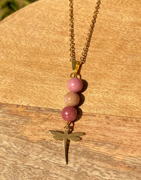 Collier libellule en acier inoxydable en pierres naturelles Rhodochrosite