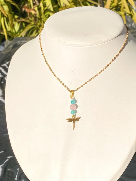 Collier libellule en acier inoxydable en pierres naturelles Amazonite et Quartz rose