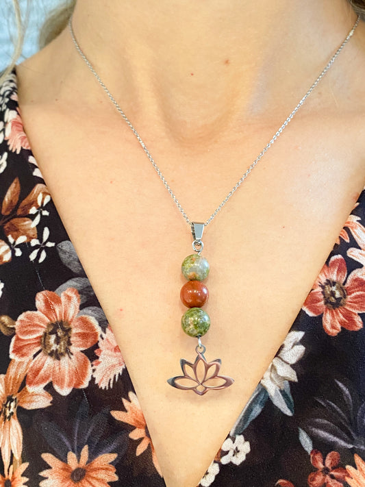 Collier en Acier Inoxydable : Élégance Naturelle avec Jaspe Rouge, Unakit et Lotus