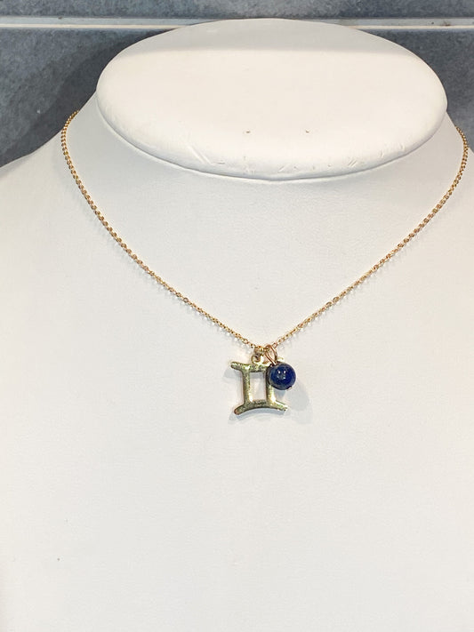 Collier gémeaux en acier inoxydable or avec pierre naturelle Lapis Lazuli