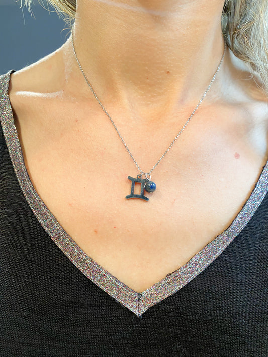 Collier gémeaux en acier inoxydable argenté avec pierre naturelle Lapis Lazuli