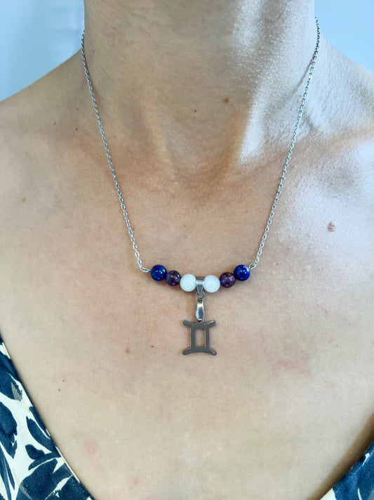 Collier Gémeaux Argenté en Acier Inoxydable avec Aigue-Marine, Lapis Lazuli et Améthyste