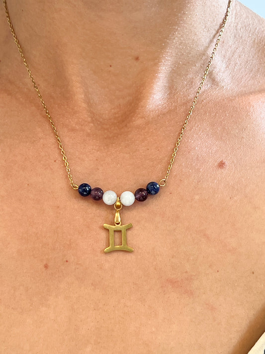 Collier Astrologique Gémeaux en Acier Doré avec Aigue-Marine, Lapis Lazuli et Améthyste