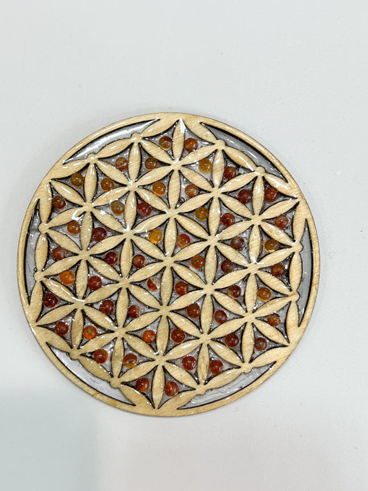 Fleur de Vie en Bois Sacré avec Cornaline – Lithothérapie & Énergie Vitale