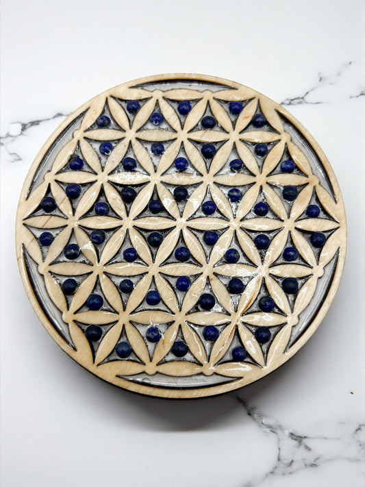 Fleur de Vie en Bois Sacré avec Lapis Lazuli – Lithothérapie & Énergie Vitale