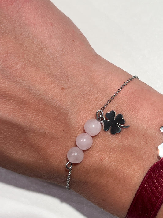 Bracelet Quartz Rose et Trèfle Argenté : Charme et Résistance en Acier