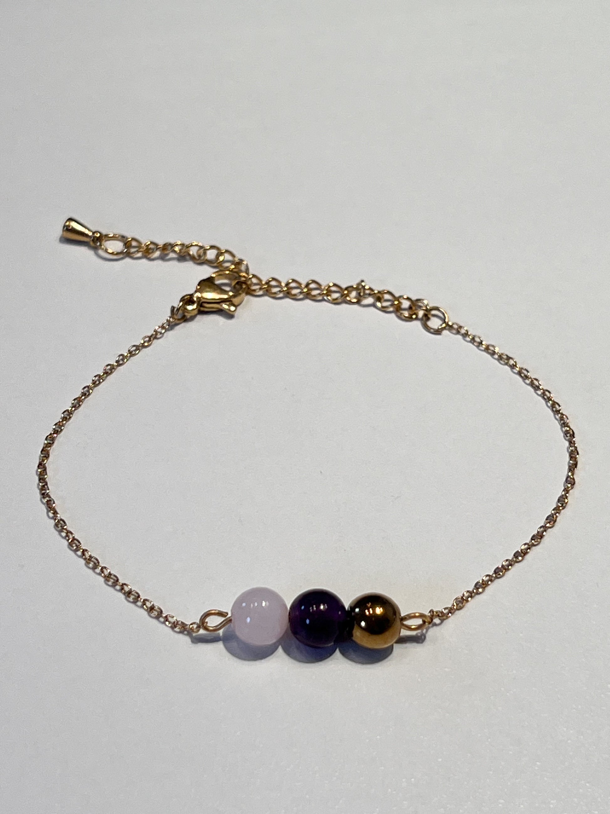 Bracelet Anti-Stress en Quartz Rose, Améthyste, Hématite & Acier Inoxydable Doré