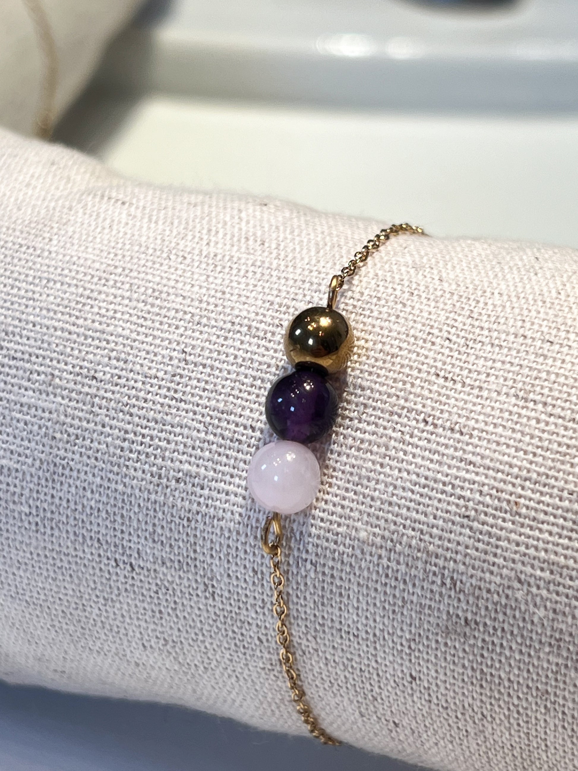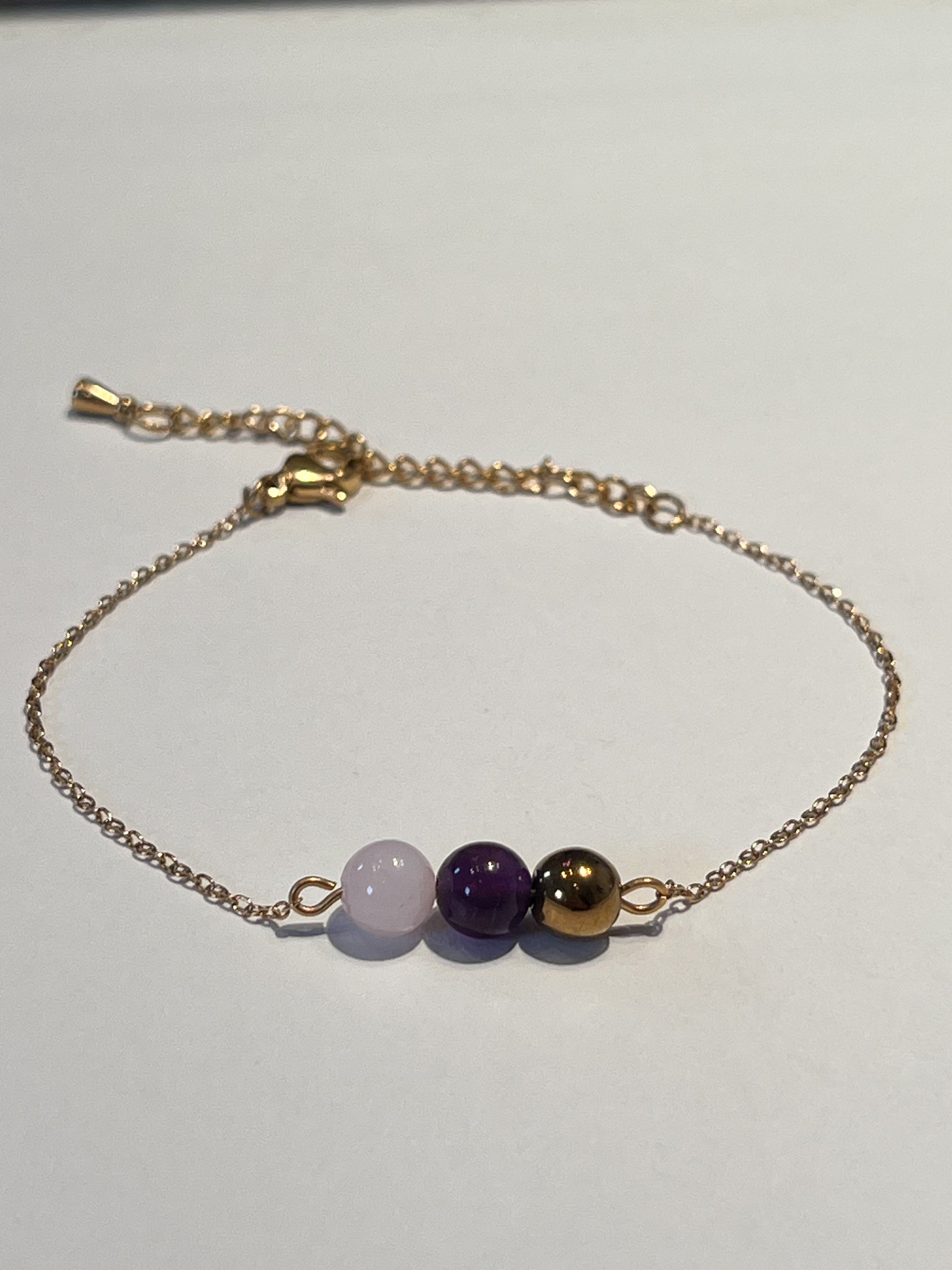 - Matériaux : Quartz Rose, Améthyste, Hématite, et acier inoxydable doré pour un éclat durable 🌟
