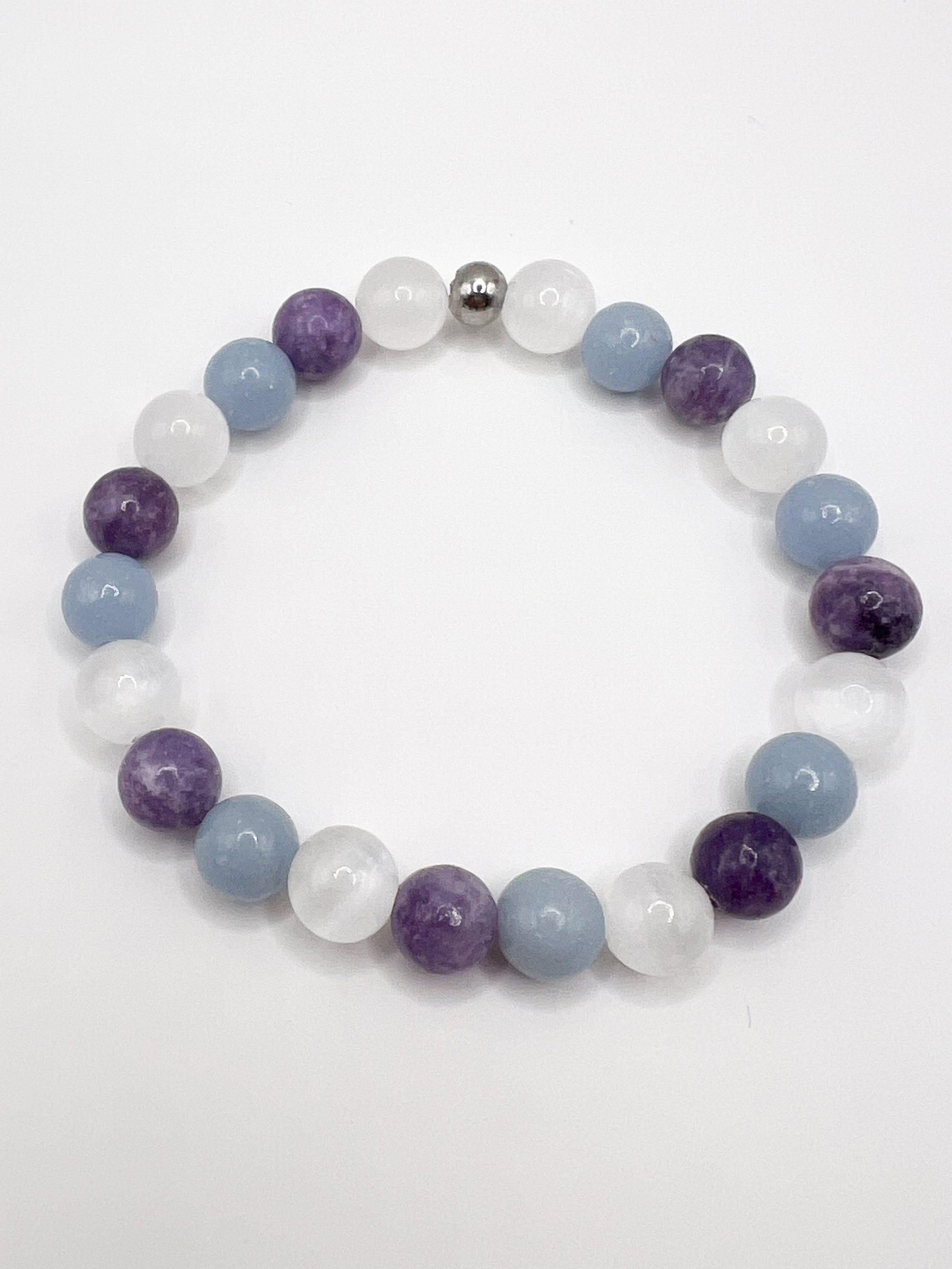 Conçu avec des perles de 8 mm et monté sur un fil nylon élastique ultra résistant, ce bijou énergétique associe trois pierres puissantes en lithothérapie : Sélénite, Angélite et Lépidolite.