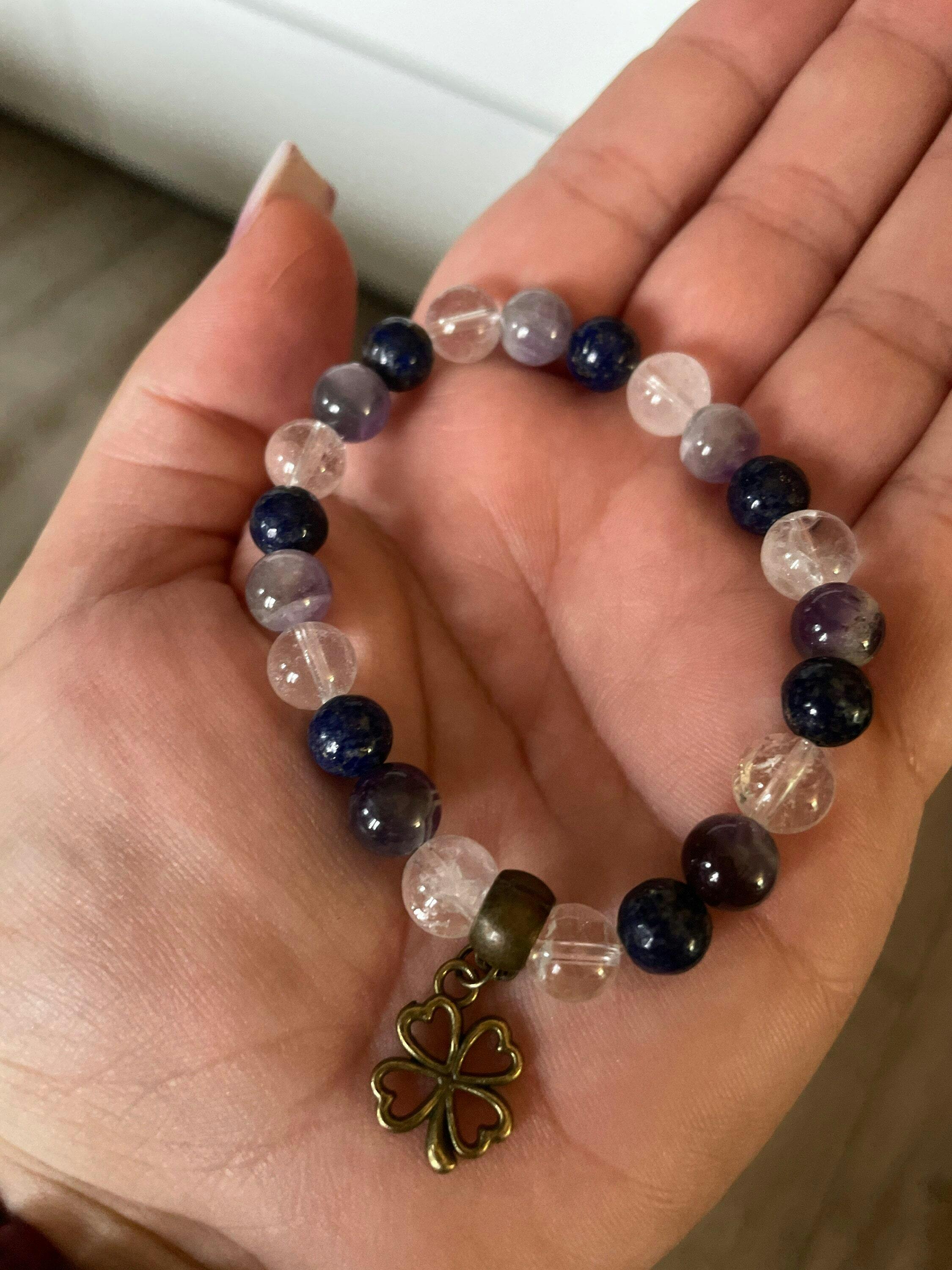 Découvrez notre bracelet anti-migraine, conçu avec des perles de 8mm en Lapis-Lazuli, Améthyste et Cristal de Roche, montées sur un fil en nylon ultra-résistant pour une durabilité optimale.