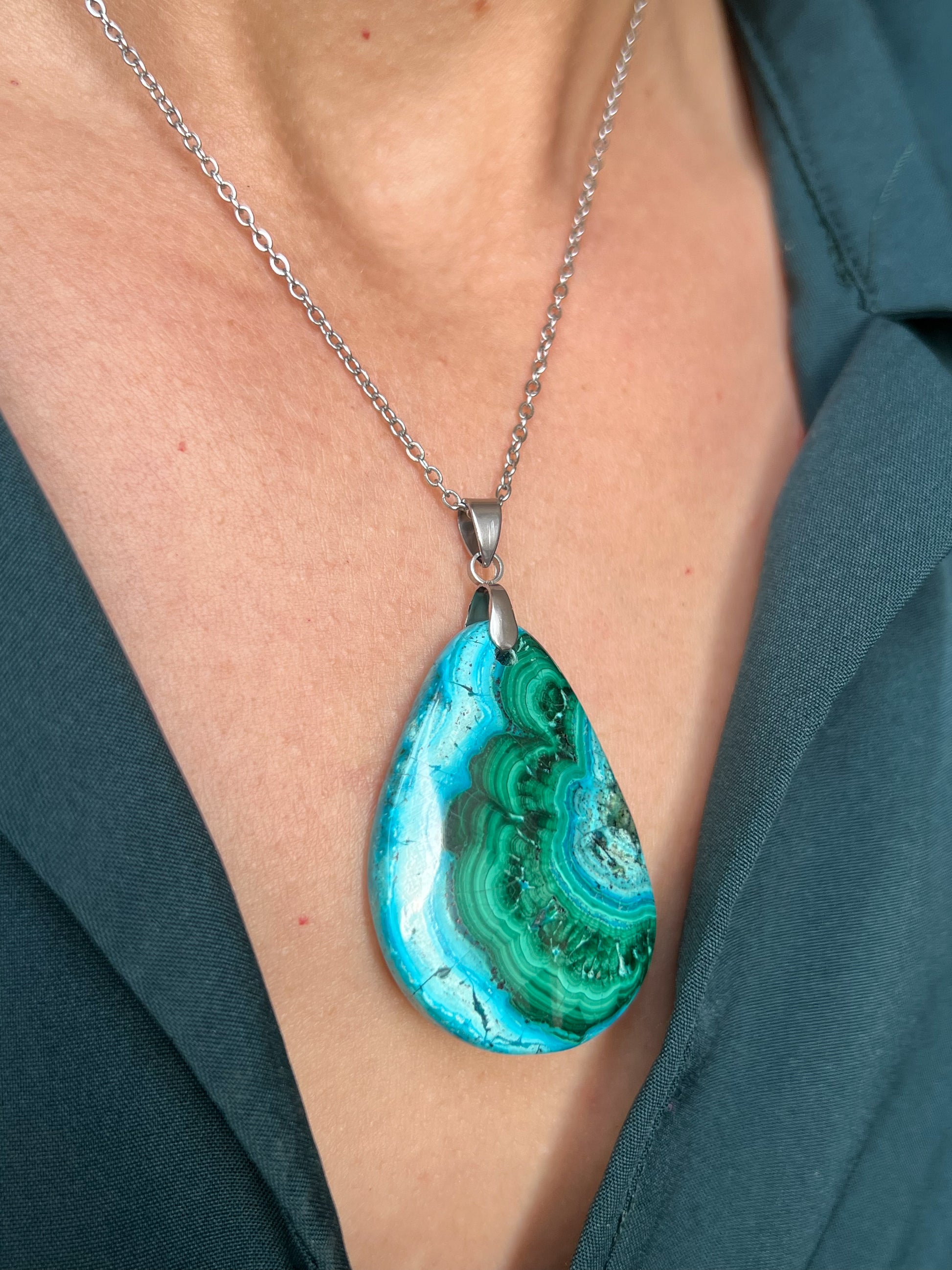 Collier azurite malachite en acier inoxydable argenté – pierre naturelle bleu vert, bijou de lithothérapie femme