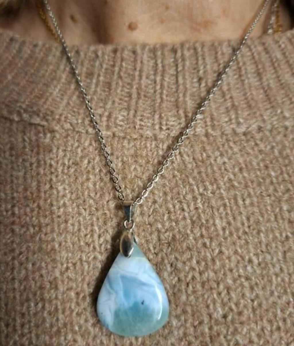 Chaque collier en Larimar est unique : la couleur, les nuances et les motifs peuvent légèrement varier, faisant de ton bijou une pièce authentique et personnelle 💎